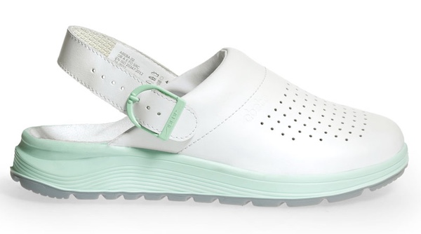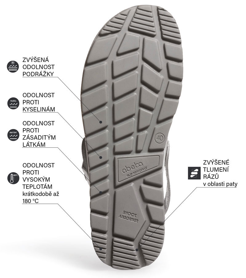 Komfortní anatomický tvar, sandál z hovězí kůže nebo z mikrovlákna, zesílená patová část, neklouzavá podrážka z PVC odolná oděru, ohybu, olejům a živočišným tukům, antistatické provedení.