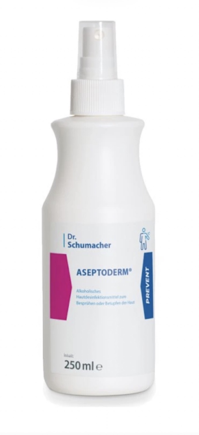 Aseptoderm - alkoholový dezinfekční prostředek na kůži, nanášený rozprašováním nebo roztíráním na kůži.