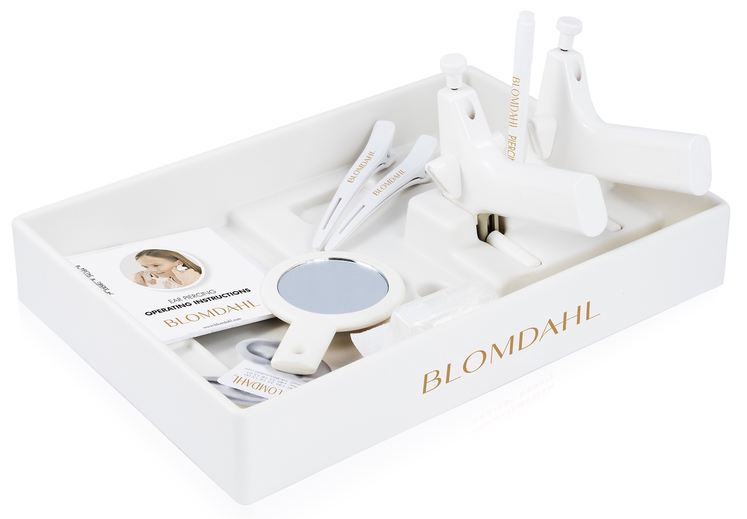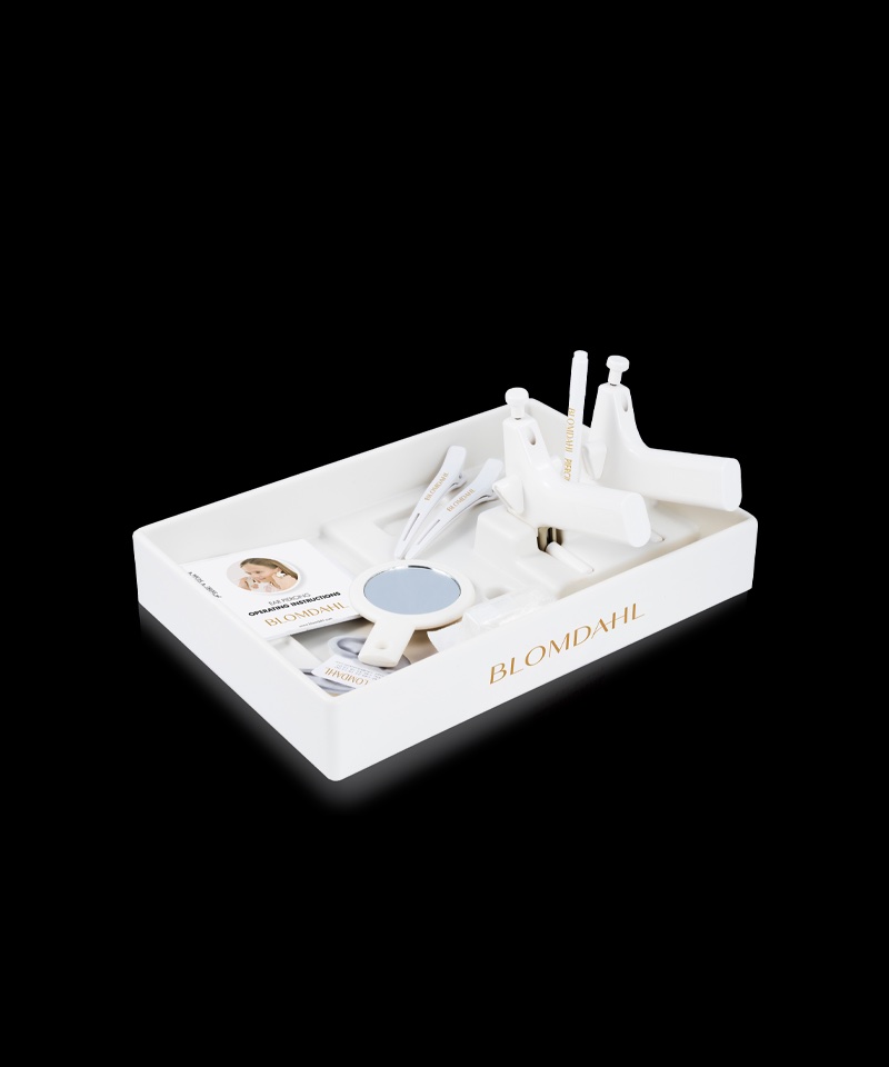 Lékařská souprava obsahuje 2 přístroje Piercer, 10 sterilních plastových náušnic krystal, čisticí čtverečky, značkovací fix, 2 papírové uši pro nácvik, 2 svorky na vlasy,, 12 vzorků náušnic, návod k použití a box pro uložení.