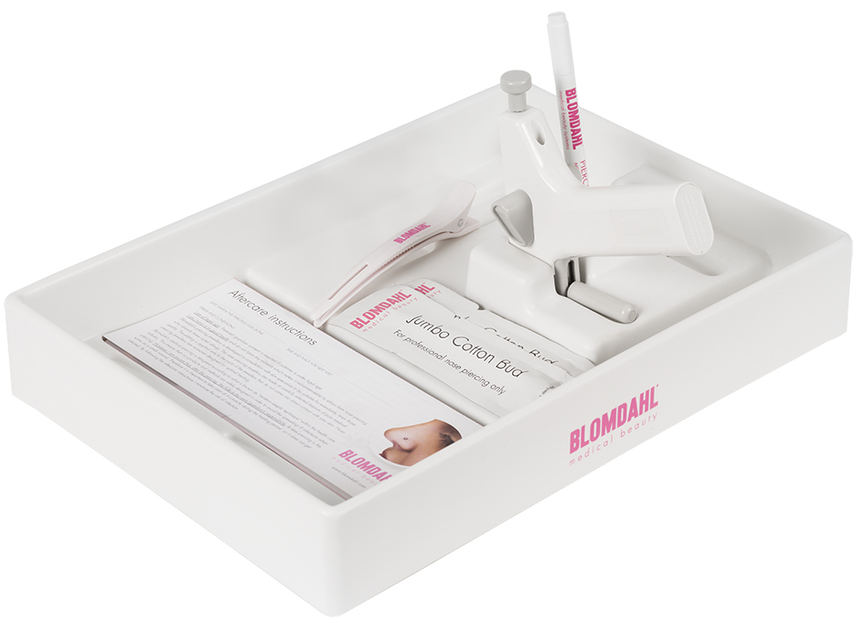 Startovací souprava pro piercing nosu obsahuje 1 přístroj pro piercing nosu, čisticí čtverečky, vatové špejle, značkovací fix, svorku na vlasy, zrcátko, návod k použití, box k uložení.