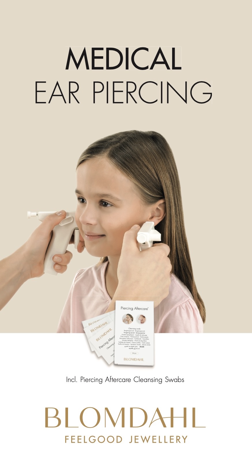 PIERCER UCHA BLOMDAHL, startovací souprava, 1 přístroj, 10 plastových náušnic krystal