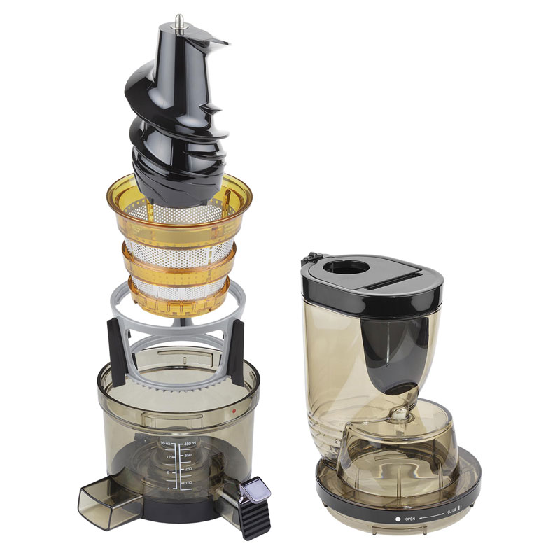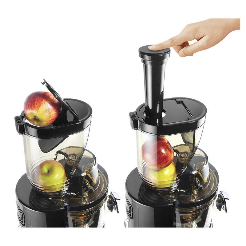 kvalitní nerezové provedení rychlost 43 otáček za minutu 3 ocelová sítka pro džusy, smoothie a sorbety velmi tichý chod vynikající výsledky odšťavňování vhodný pro výrobu rostlinných mlék jednoduchá manipulace a čištění velký plnicí otvor nádoba na odpad nádoba na šťávu pěchovadlo a čisticí kartáček
