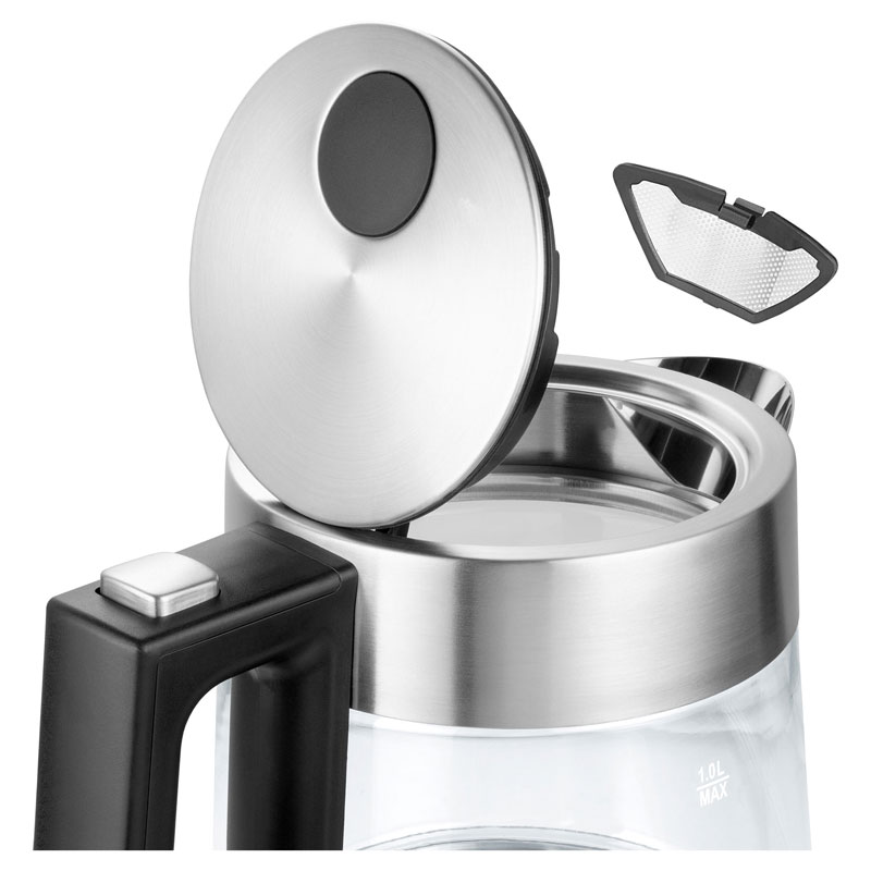 Konvice je vybavena ochranou proti přehřátí. Kvalitní bezpečnostní sklo v kombinaci s nerezem zkrášlí každou kuchyňskou linku. S kapacitou 1 litr šetříte čas i energii, ohříváte jen tolik vody, kolik potřebujete. V tom vám pomůže i dobře viditelný vodoznak.