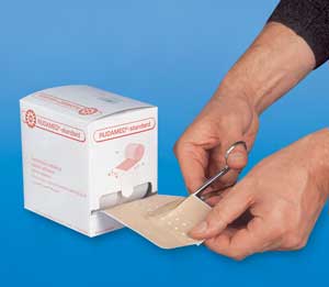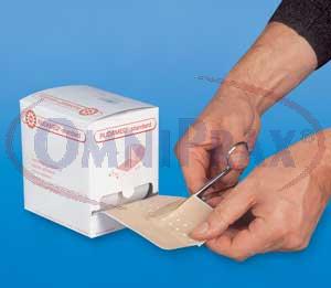 Rychloobvaz z textilní, pevné hnědé tkaniny, která je opatřena velmi dobře lepicím zinkooxidovým lepidlem.