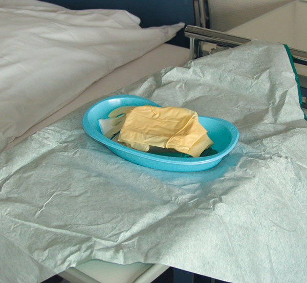 Sterilní souprava ke katetrizaci močového měchýře obsahuje ledvinku, misku na tampony s 5 kulatými tampony (velikost švestky), 2 mulové krytí o rozměrech 7,5 x 7,5 cm (8 vrstev), 1 jednorázovou pinzetu, 1 krytí s otvorem (60 x 60 cm), 2 latexové rukavice (medium, nepudrované), 1 podložku nepropustnou pro vodu (60 x 60 cm).