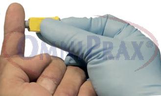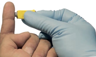 3. přitisknutím na odběrové místo se uvolní pérový mechanizmus a lanceta penetruje kůži