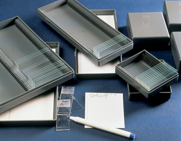 Box pro podložní sklíčka je vyroben z nerozbitného polystyrenu, používá se pro jednoduché uskladňování podložních sklíček.