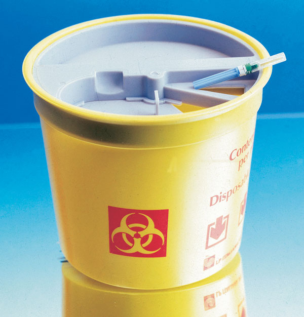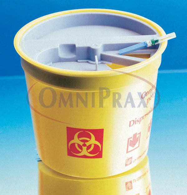 Kontejner k bezpečnému uskladnění a zničení kontaminovaného zdravotnického odpadu jako jsou stříkačky, kanyly, znečištěné čtverečky, apod.