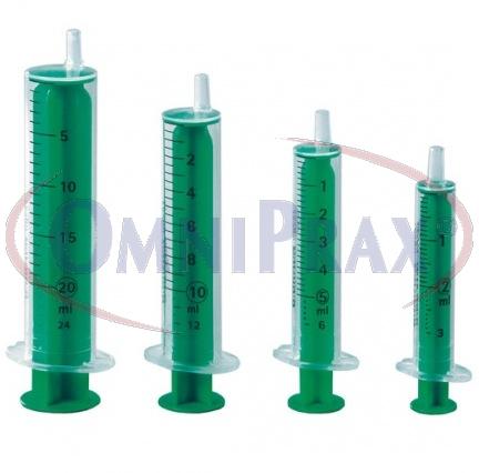 Značkové sterilní dvoudílné stříkačky se zeleným pístem.