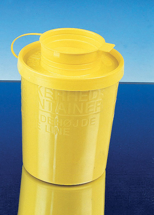 Speciální bezpečné nádoby na použité jehly a stříkačky.