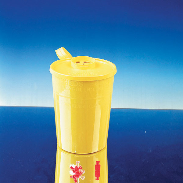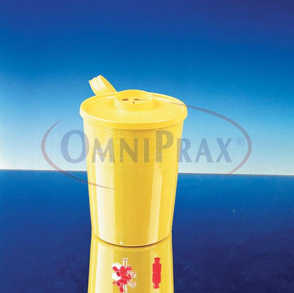 Model 9 - objem 2000 ml, výška 17,8 cm, průměr dole 11,0 cm, průměr nahoře 13,5 cm, nádoba je vhodná pro jehly i stříkačky, barva víka i nádoby žlutá.