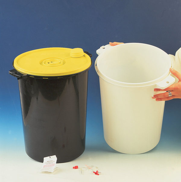 Speciální bezpečné nádoby na použité jehly a stříkačky.