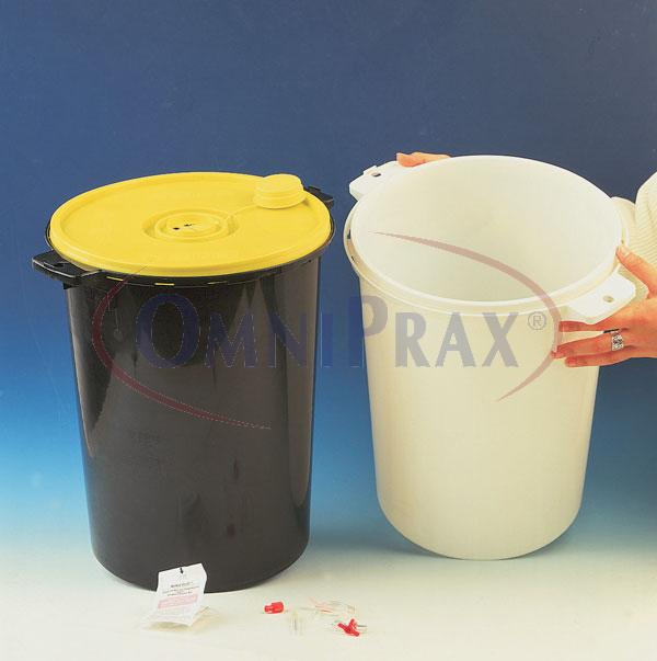 Objem 20000 ml, výška 39 cm, průměr dole 25 cm, průměr nahoře 29 cm, nádoba je vhodná pro jehly i stříkačky, barva nádoby černá, víko žluté.
