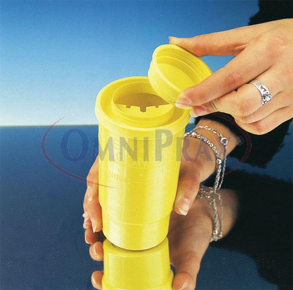 Model 4 - objem 500 ml, výška 14 cm, průměr dole 6,0 cm, průměr nahoře 7,5 cm, nádoba je vhodná pro jehly i stříkačky, barva víka i nádoby žlutá.