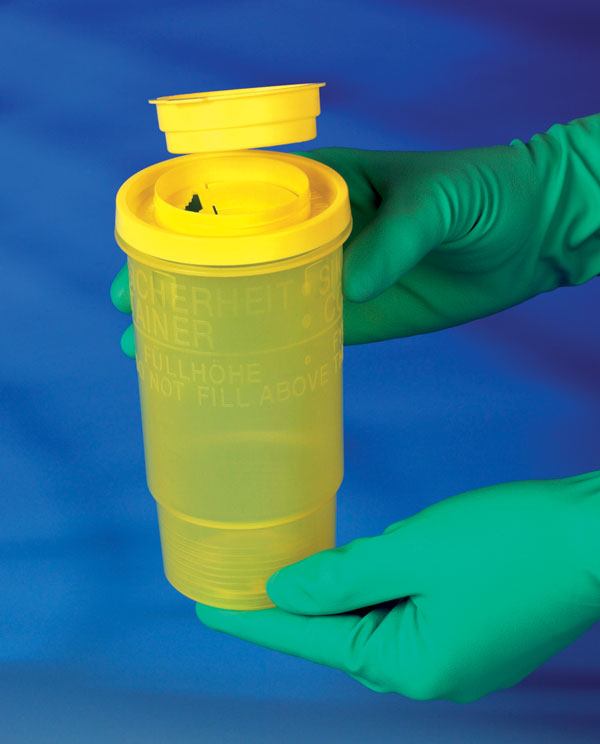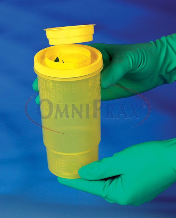 Model 2 - objem 500 ml, výška 145 mm, průměr nahoře 70 mm. Nádoba je vhodná pro jehly i stříkačky.