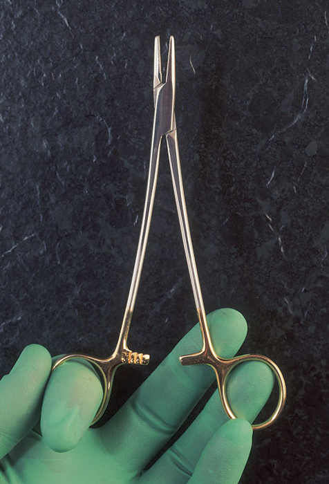 Popis: Jehelec, Hegar-Mayo, tvrzená ocel WIDIA, pozlacená rukojeť, délka 160 mm