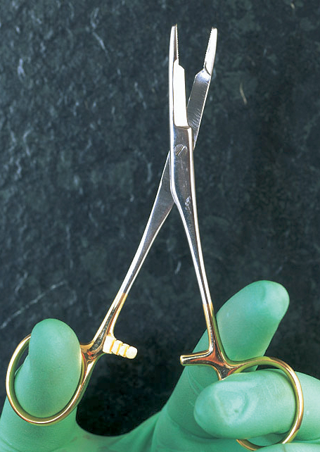 Popis: Jehelec, Hegar-Ohlsen, s nůžkami, tvrzená ocel WIDIA, pozlacená rukojeť, 145 mm