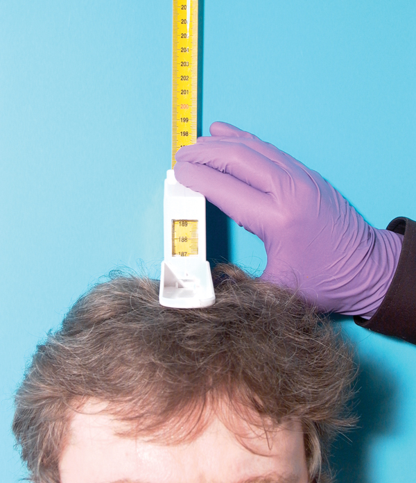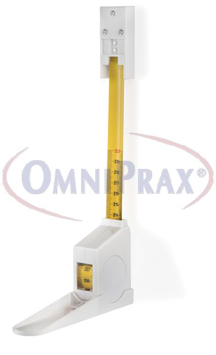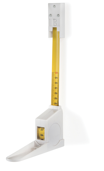 Připevní se na stěnu do výšky 2,2 m, pacient se postaví ke stěně a při měření se rameno metru stahuje k temeni hlavy pacienta. V okénku se odečte výška.