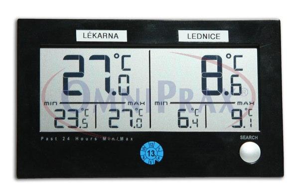 * měří teplotu v lednici a v příruční lékárně * zaznamenává maximální a minimální teplotu * akustická signalizace překročení nastavené mezní teploty * rozsahy - 10 až + 50 stupňů Celsia, - 20 až + 50 stupňů Celsia * přesnost +/- 0,5 stupně Celsia * rozměry 137 x 17 x 83 mm * součástí dodávky kalibrační list