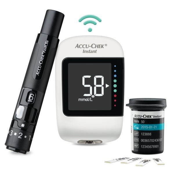 * glukometr Accu-Chek Instant * odběrové pero Fastclix * 10 testovacích proužků * lancety * pouzdro * návod k použití